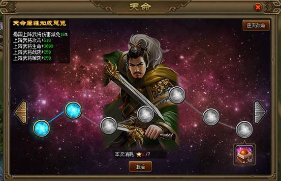 天命属性还有根据国家来进行加成的,你选的是吴国,那么首发阵容里的吴国武将伤害减免达到28%,其他的国家无效!如果你后期得到多个其他国家的极品武将,可以选择逆天改命来改变君主相性,花点元宝就可以了,V6可以同时激活两个国家,V8可激活三个郭嘉,V10最全能,四系全修!