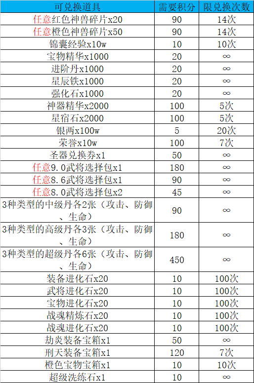 4、部分道具在一个结算周内有限制兑换次数,∞为不限制兑换次数;